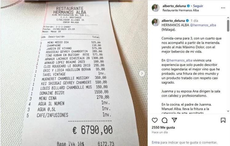 This is the latest gastronomic adventure that popular influencer Alberto de Luna shared on his social media. Known for his lavish and expensive meals, Alberto de Luna, a lawyer by profession, ate at Hermanos Alba, located on Avenida Salvador Allende, in Echeverría de El Palo. The food critic, loved by many and hated by others, described the experience as "legendary" and even said that he had enjoyed "the best drink" of his life. "The best wine I have ever tasted, fried food from another world and a product treated with almost sacred respect," he said on his Instagram account. The post was accompanied by photos of the receipt, the food and the restaurant.